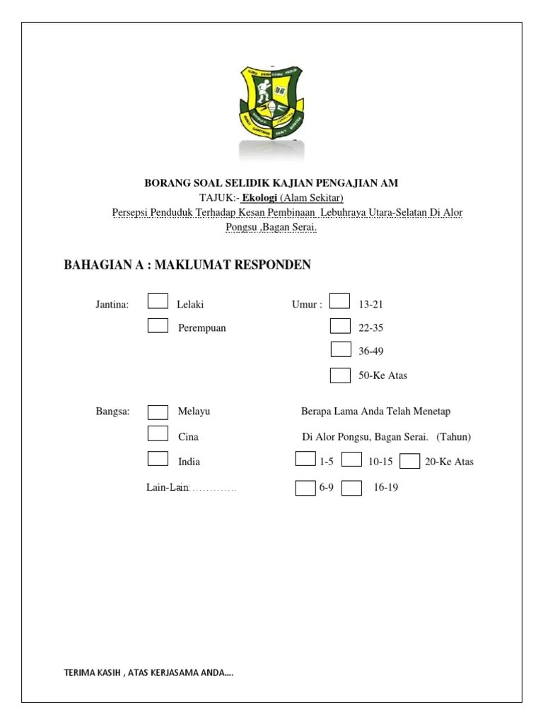 View borang soal selidik pa.docx from pengajian am 520 at sekolah menengah king george v. Contoh borang kaji selidik kerja kursus pengajian am penggal 2 stpm. Contoh borang kaji selidik kerja kursus pengajian am resep kuini. Bagi kaedah kajian adalah membuat rujukan perpustakaan, pemerhatian, soal selidik dan temu bual.